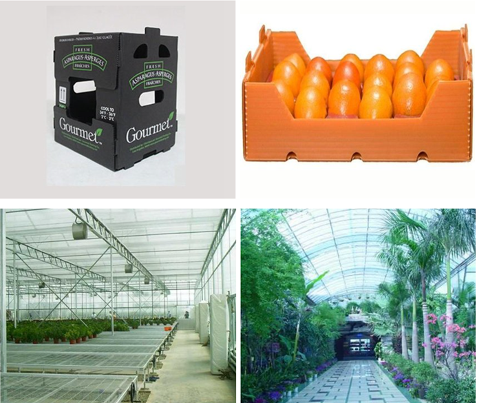 Los productos de lámina hueca de PP se utilizan principalmente en el embalaje de exportación de verduras, alimentos, pesticidas, productos industriales ligeros, artículos duros, material de construcción, también se utilizan en el equipamiento de electrodomésticos, publicidad y decoración interior y exterior, decoración de las exposiciones a gran escala, la materia prima de las cajas de rotación, las bases de los jarrones y las cubiertas superiores para los automóviles, etc.